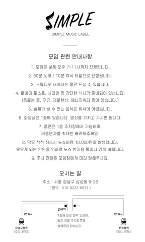 성인 취미 노래 동호회! 감상도 환영해요☺️ 🎵 SIMPLE IS BEST ️⭐️ 음악을 사랑하는 사람들의 휴식처 심플뮤직 입니다! 소모임 2025년 2월 7일 첫모임💕 ⭐️ 심플뮤직에서는 노래, 랩, 악기, 작곡 등 모든 음악에 대한 친목 모임을 추구해요 ☺️ ⭐️ 정기적으로 소규모(최대8인) 노래 모임, 비정기적으로 버스킹 공연을 진행해요. 배우고 싶은 분들을 위한 보컬 레슨 클래스까지! (유명유튜버 포함한 하이퀄리티 트레이너 다수) ⭐️ 2025년 심플 뮤직 스튜디오 오픈 강남구 삼성동 위치한 보컬 스튜디오, 녹음실, 합주 및 야외공연, 버스킹을 위한 모든 장비들이 완비되어 있어요! (최고급 컬럼어레이 스피커 및 디지털믹서 등) 심지어 참가비에 간단한 스낵바까지 포함이라니..💕 ⭐️ 해치지 않아요😊 실력이 부족하다고 느껴도 괜찮아요 관객으로 참여하는 멤버도 환영합니다~ 단톡방에서 소통하면서 친해져요! ⭐️ 이런분들 꼭 오세요! 음악을 사랑하시는분, 소규모 공연을 하고싶으신 분, 공연을 보고 싶으신 분, 레슨을 받고싶으신 분 🚫 단순 이성목적, 타모임 유도, 과도한 영업, 폭력적인 언행을 보이는 분은 강퇴될 수 있음을 기억해주세요‼️
