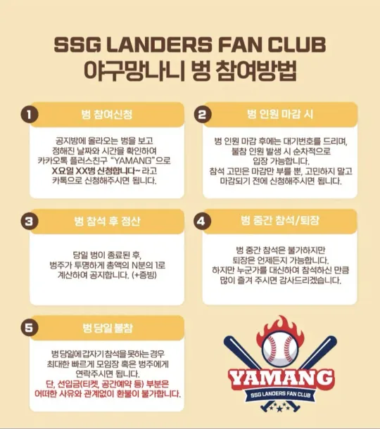 SSG랜더스 응원하는 단관모임 ❤️ 야구뿐만 아니라 타 스포츠도 직관가요⚽️🏀🏐🏒 같이 열심히 응원하고 밥이나 술 먹어요🍻 함께 여행도 가서 좋은 추억 만들어요☀️ 같이 레져도 즐기고 볼링, 스크린야구 등도 해요💪🏻 맛집 다니면서 맛있는 음식,술 함께해요🍚 카카오톡 단톡방에서 수다도떨어요😁 회원가입조건 ✔️SSG랜더스 팬만 가입 가능(중복 가입 불가) ✔️연애 및 이성 목적 가입 불가능 ✔️야구 관련 타 모임장 및 운영진은 가입 불가 ✔️모임장 승인없는 개인연락 금지 문의사항은 yamanghj으로 카톡주세요🙇🏻♂️ 인스타그램 ssg_yamang