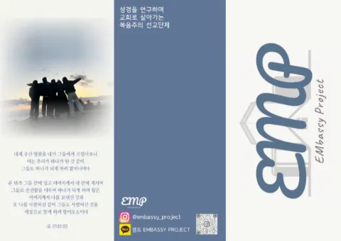 ❣️크리스천 청년 공동체 앰프입니다❣️ 피상적 믿음을 떠나, 실제적 삶으로! * 가입 2시간 이내 가입인사 및 한 달 이내 모임 참석 필수 🫂주의 청년들이 매주 서울숲에서 함께 하나님 말씀을 배우고, 자신의 교회를 섬기며 그리스도인답게 살기 위해 애쓰고 있습니다. 빛과 소금으로 살아가는 인생의 귀한 동역자가 되길 소원합니다. 📕귀납적 성경 연구: PBS(Personal Bible Study), GBS(Group Bible Study)(성경묵상나눔, D형Q.T) 📗북쉐어링: 필수 신앙서적을 함께 읽고 나누는 시간 📙LTC: 원투원, 주기도문, 사도신경, 십자가, 기독교 세계관, 변증 등 💙가족여행: 말씀 안에서 가족됨을 누리며 떠나는 국내외 여행 💒성도의 교제: 함께 묵상한 말씀으로 일상을 살아가는 매일의 교제 🚫본 모임은 각 교단이 정한 이단 단체 및 교회에 속한 사람의 참여를 엄금합니다. ⛔️이성 목적, 보험, 영업, 홍보 거절합니다. ⚠️나이 제한 : 남: 96년생 /여: 92년생 💒현 장신대신대원생, 전 교단파송 단기선교사, CCC 총•대표단, 기독학생연합 출신 등 건강한 신앙을 가진 청년들이 모인 공동체 💌 Insta: embassy_project