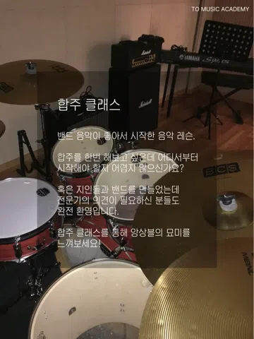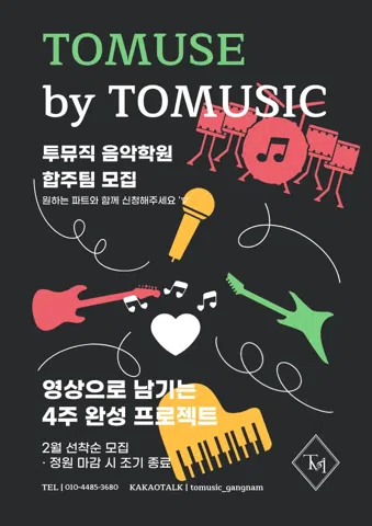🎶성인 전문 음악레슨 투뮤직🎶 따분한 일상속에 지친 사람들 모여라!! 가입 후 자세한 내용은 공지 참고해주세요😘 이런분들 와주세요❤️ -일상에 지쳐 음악으로 힐링하고 싶으신분 -피아노,보컬,기타,드럼,베이스,작곡을 배워보고 싶으신분 -합주를 해보고 싶으신분 -음악을 공유하면서 친해지고 싶으신분 🎵성인분들을 위한 힐링 보컬,피아노,기타,드럼,베이스,작곡 레슨 🎵연 2회 공연 🎵연습실 무료 사용 🎵보드게임,영화,방탈출 등 취미공유 ♥️문의는 010-4485-3680 또는 카톡 아이디 tomusic_gangnam