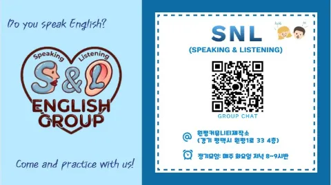 WELCOME TO SnL (평택/안성/오산) SnL means Speaking and Listening. * 정기모임- 수요일 오후 8시~9시반, @원평커뮤니티제작소 (평택역 2번 출구 부근) * 번개모임- 주말벙, 외국인도 함께하는 문화교류 정기모임 참가비: 회당 3000원 (1회차 참가비X) 초보도 ok~ 대신 단톡방에 올라오는 토픽을 미리 숙지해주세요! 동의 시 SnL 오픈채팅방으로 입장 ㄱㄱ https://open.kakao.com/o/guug8i2f