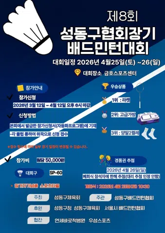 성동구 배드민턴 연합회 배드민턴 클럽입니다🏸 1️⃣ 가입조건 📢 26년 상반기 : 초심 가입불가 ⚠️ 50대 이상은 A조만👍 ⚠️ 가입시 자기소개 작성(양식준수) 2️⃣ 회비 ✨️ 클럽연회비: 10만원/1년, 5만원/6개월(1월~6월,7월~12월) ✨️ 체육관이용: 각자 결제 후 입장 월권 : 3만원/1개월 (클럽회원 금액) 💰 계좌번호 카카오뱅크 : 7942-26-65198 [문다은] 3️⃣ 시간 및 장소 ❗️오전 9시50분~오후 12시50분 ❣️주소 : 성동구 금호로 20 (금호스포츠센터) ❣️클럽코트 : 1,2,5,6번 ❗️정모 참석투표 : 연회비납부자 ❗️연회비 미납자는 게스트와 동일합니다. 비매너❌️ 4️⃣ 공용콕 ‼️ 콕 2개 (제출 후 명단에 이름적기) *동절기(12월~2월)는 남자3개/여자2개 삼화블랙, KBB79, KBB5000(샵 구매가능) 5️⃣ 게스트 신청 🧑🤝🧑 게스트신청 게시판에 하루 전 21시까지 신청 + 게스트비 5000원 입금 (당일신청❌️) 🧑🤝🧑 운영진이 댓글에 승인👍된 게스트만 참석가능 🧑🤝🧑 월-금 4명, 일요일은 16명까지 신청 가능 이외에 궁금하신 부분은 언제든지 문의 가능 💌010-9152-5417, 010-8590-0807