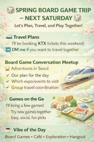 🎲 Roll the Dice. Start the Conversation. 🗣 🎲 Board Games & Social Events 🤝 Friendly Conversation 💬 🗣 English mainly (Korean welcome) ✅ No membership fees 📍 Areas: 신불당 & 배방 ⏱️ 90–120 minutes 🗓 Usual meeting weeks: 1st, 3rd & last week of each month • Fri & Sat evenings (starting around 7–8 PM) • Some Sun evenings in Baebang • Occasional pop-up meetups 🎉 Sometimes also: 🎳 🎱 🎬 📚 🎮 🎤🚗 🍜 --> Check the bulletins' extra info or send a DM 🎲 Level Up Your English! 🗣️ A friendly meetup for board games, conversation, and group activities. All are Welcome — Good Games — Good Company Say hello and introduce yourself.
