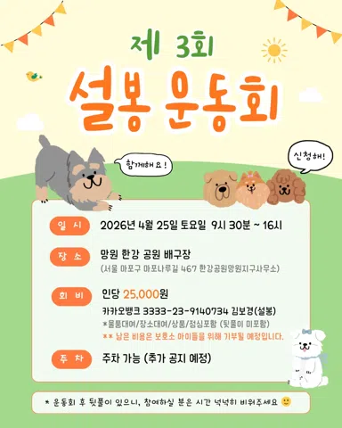 🐶매주 토요일!일요일! 유기견봉사🦮 💌서울경기 유기견 봉사모임💌 🦮하나 보단 둘, 둘보단 셋이 훨씬 도움이 되는게 유기견 봉사이기에.. 조금이나마 더 아이들에게 큰 도움이 될수 있길 바라는 마음으로, [설봉]이란 모임으로 시작하게 되었습니다. 🐕🦺 [설봉] 인스타그램 : @sulbong_2022 🐈오픈톡방 : 설봉(설레는 봉사모임) ▶️ 매주 주말 주1-2회 유기견묘 보호소 소,중,대형견 견사청소, 산책, 시설보수 등 ▶️ 게시판 공지사항에 모임 회칙 확인해주세요. ▶️봉사 신청은 게시판에 봉사공지글에 댓글로 신청해주세요. ▶️ 파주 유사천, 파주 빅독포레스트, 포천 용녀쌤네, 오산 보호소, 김포 하우네, 파주 아크등 💓 [설봉후원계좌] 💕 카카오뱅크 3333-23-9140734 김보경(설봉)