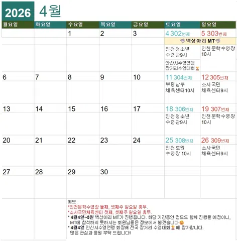 수영 맛집 😋 🏊♂️ ✔️ SINCE 2022.11.26 🦈 ✔️ 가입조건 : 자유형 100M 완영 가능 ✔️ 정모일 : 매주 토요일, 일요일 ✔️ 회비 : 월 3천원(반납/분납/연납) (신입회원은 정모 1회 참석 후 적용) ✔️ 주 활동 수영장 문학박태환수영장(50m) 인천청소년수련관수영장(25m) 소사국민체육센터(50m) 시흥 사설수영장 대관 등 ✔️ 주말엔 FUN 수영! 🤗 ✔️ 수영대회도 즐겨요! 😎 ✔️ 열정만 가져오세요 😆 ✔️ 혼자 쓸쓸히 자수말고 함께 빡세게 해요!💪 ✔️ 다른 수도권 수영장 투어도 같이가요 🏃♂️🏃♀️ ✔️ 매 정모마다 수준있는 프로그램 구성 💻 ✔️ 분기별 강사 초빙, 동호회 교류 등 다양한 행사 진행 예정 ✔️ 함께 만들어요 화목한 백상아리 (빠른년생 인정❌️, **님 호칭⭕️, 본명사용) ✔️ Kakaotalk 오픈채팅 'TEAM 백상아리' ✔️ Instagram @team_greatwhiteshark ✔️ Mail teamgreatwhiteshark@gmail.com
