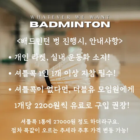 좋은 인연으로 오래 봐요 우리✨ Whatever We Want, WWW! 🥇Since 2022.06.01 ~ ing 🔹카페투어, 맛집투어, 핫플투어 🔹와인, 막걸리, 위스키, 쏘맥 한잔 🔹러닝, 테니스, 등산, 풋살, 보드게임 🔹영화, 공연, 피크닉, 페스티벌 등 함께해요! 🔜 업로드 예정인 활동 6월 13일 RUN10 🏃♂️💨 ✅가입조건 ▪️세종에서 일하거나 거주하는분 ▪️88년생-98년생, 빠른 인정✖️ ▪️밤 12시 - 아침 6시 사이 가입✖️ ▪️영업, 기혼, 돌싱✖️(세종 좁아요) ▪️더블유 포함 가입 모임은 3개까지! ⚠️가입안내 ▪️가입 후, 24시간 이내 자기소개서 작성 ▪️자기소개서 작성 후, 삭제 금지 ▪️개설된 자유벙 자유롭게 참석 가능 ▪️자유벙 1회 참석 후, 월말 정모 참여 가능 ▪️가입 후 1달간 참석 없이 눈팅 시, 강퇴 조치!