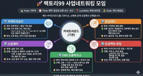 --- 🚀 팩토리99 사업네트워킹 모임 안녕하세요, 모임장 구본욱입니다. ⏰ 매주 일요일 오후 4시 - 6시 📍 투썸 성안길 💰 개인 음료값 --- 📌 프로그램 소개 1️⃣ 커넥트