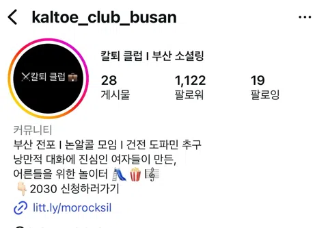 영화보고 책읽는 논알콜 대화 모임🗣️ 소모임 가입없이 인스타로도 신청가능 @kaltoe_club_busan 미드 "프렌즈" 같은 커피향 나는 쇼파가 있는 공간, 친구와의 대화, 아지트가 갖고 싶어서 모임장이 직접 만든 공간 ☕️ 위치 전포. 평일 모임 : 19:30 ~ 21:30 토요일 모임 : 17:00~ 19:00 일요일 모임 : 14:00 ~ 17:00 ⚔️칼퇴 클럽 프로그램💼 📎3월의 컨셉 : 다큐멘터리와 독서 -칼퇴 시네마 클럽 🎬 영화를 함께 보고 대화를 나누는 프로그램 3월은 모두 다큐멘터리로 편성 되었습니다. 대화할거리가 많은 정말 흥미롭고 꿀잼인 다큐멘터리로만 넣음 (다큐멘터리 90분 / 대화시간 약 1시간~1시간 반) - 숙제없는 느슨한 자유 독서 북클럽 📚 각자 읽는 책을 들고 와 30분씩 읽기 10분간 독후감 타임 후 책에 대해 북토크 1시간! 이참에 사놓고 먼지만 쌓여가던 책을 완독해 보세요 호잇짜📖 (공간에 책이 있어서 책 안들고와도 읽을거리 👌) 🙅♀️모든 모임 커플 동반 참여 불가 🤫물관리 합니다 나이는 20대-30대 평일:3만원 주말:3만 5천원(공휴일 적용) 올나잇 시네마:4만원 칼퇴 후 ⚔️ 달려오세요 아지트로!