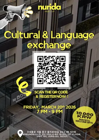 Learn Korean. Live like a local. Meet the people. (IG:@nurida.co) 한국에서 새로운 도전을 시작한 외국인 분들과, 외국인 친구들과 자연스럽게 교류하고 싶은 한국인 분들이 함께하는 언어·문화 교류 커뮤니티입니다. 편하게 이야기 나누며 서로 배우는 시간을 좋아하는 분들을 위한 모임이에요. 😊 ⸻ 🧑🤝🧑 참여 대상 본 모임은 20대 초반 외국인 참여자가 많은 특성을 고려하여, 원활한 균형을 위해 1992년생까지 참여 가능합니다. ⸻ 🌟 모임 활동 • 한국어 & 영어 언어 문화 교환 • 트렌드 체험, 게임 등 소규모 액티비티 ⸻ 📅 모임 안내 • 월 1~2회 진행 (2026년 첫 모임 3월진행) • 금요일 저녁 7시 (을지로 진행) • 문토, meetup, luma 에서도 참가자 모집. 보통 20-30명 참여 ⸻ 🌿주의 사항 • 본 모임은 연애나 만남 목적이 아닌 교류 중심의 모임입니다. (일부 멤버들이 곤란한 메시지를 받은 사례가 있어, 이를 방지하기 위해 안내드립니다. 타 모임 가입 부탁드립니다)
