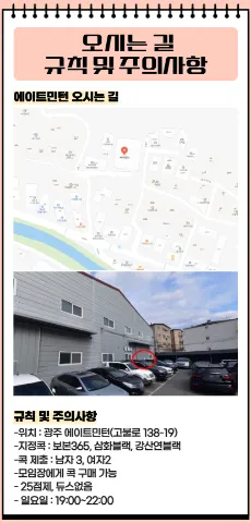 ♥️매주 일요일 17시~20시♥️ 🏸비용 ▪️월 회비 ❌️ ▪️대관비 N빵 ▪️남🔸️콕 3개 제출 ▪️여🔸️콕 2개 제출 🏸일정 ▪️일요일🔸️17:00~20:00 🏸장소🔸️광주 에이트민턴(고불로 138-19) 🏸조건 ▪️88년생~07년생(추천 시 제한❌️) ▪️남🔸️구력 6개월 이상 ▪️여🔸️랠리 가능한 자 🏸지정콕 : 보본365, 삼화블랙, 강산연블랙