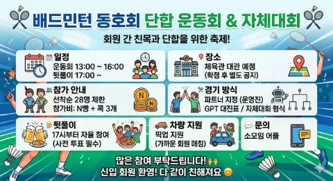 ⭐Since '25.10월~ 안녕하세요😄 초보부터 A조까지 즐겁게 어울리는 빛나는 인천 2030 배드민턴 모임, PANGPANG(팡팡)입니다✨ 우리 모임은 빡겜도 좋지만 서로 도우며 하하호호 재밌게 운동하는 것을 지향해요😘 ⭐ 가입 조건 - 나이: ~87년생 - 구력: 열정초심 ~ D조 이상 - 초심자 배려하는 인성 및 열정 중요😍 ⭐ 운동안내 🏅 정기운동(올림픽) - 수 19~22시 - 토 07~09시 ⚡ 번개운동(올림픽/연체공) - 새벽운동: 06~09시 - 저녁운동: 19~22시 ⭐ 셔틀콕/거트 - 삼화 블랙급 이상 2개(게스트/지각 3개) - 모임 내 박스가 구매 가능 - 거트 최저가 용품점 연결 ⭐ 운영안내 💁🏻♂️ 가입 당일 할일 -자기소개 작성/가입비 5,000원 납부 후 참여(회비 X) (국민 672301-04-013451 김준서) 💁🏻♂️ 모임 진행 - 단체티/자체대회/급수별 보드판 매칭 - 초심자 기본기 훈련/매월 유령회원 정리 🎬 팡튜브: @pangpang_public 👨👨👧👦 팡스타그램: @pangpang_public