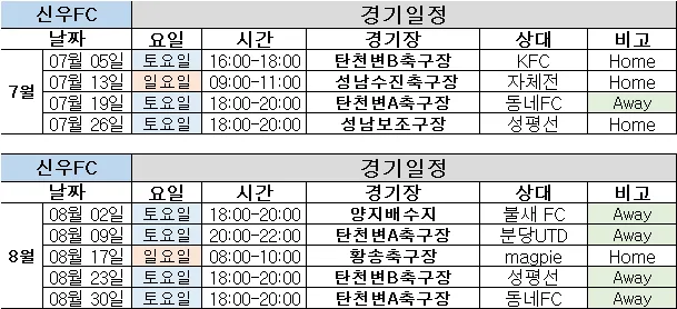 ⚽️ 가입/경기 문의 ❤️여자마감❤️ 🔅축구에 대한 "관심,열정,소속감"지참하신분 이라면 언제든 환영합니다.🔅 신우FC는 2002년부터 성남(수정구/중원구/분당구), 광주를 연고로 하는 조기축구회로 활동하고 있습니다. ⚽️ 주로 운동 중인 구장 (토/일) - 탄천변 제1체육공원 A/B 구장 - 황송공원 구장 - 성남 공설운동장 보조구장 - 배뫼산 축구장 - 상대원 유소년 / 양지배수지 구장 신우는 개인능력보다 팀플레 위주로 운영하려 노력중입니다. 축구를 안해보신분이나 체력이없으신 분들은 가입 힘듭니다.참고 하시기바랍니다 ☆ 매너 필수 ☆ 가입인사 필수 ☆ 한달간 무료 이후 월회비 또는 연회비 납부 ♧♧팀 단톡방이 별도운영(인원 40명)♧♧ 가입후 한달동안 참석없으면 강퇴합니다 한달이상 미 참석시 강퇴됩니다 가입비- 유니폼 포함 5만원 월회비 2만 연락 : 총무 010-2744-7618