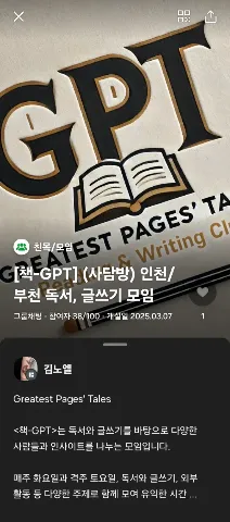 Greatest Pages' Tales <책-GPT>는 독서와 글쓰기를 바탕으로 다양한 사람들과 인사이트를 나누는 모임입니다. 매주 화요일과 격주 토요일, 독서와 글쓰기, 외부 활동 등 다양한 주제로 함께 모여 유익한 시간 보내요. 대중문화 유튜버이자 인문학 전공자, 영화평론가 준비생인 모임장이 함께합니다! 1주차: 자율스터디 2주차: 글쓰기 3주차: 자율독서 4주차: 지정독서 5주차(있는 경우): 자율독서 책-GPT는 - 문학과 글쓰기, 자기계발을 사랑하는 분들을 환영합니다. - 쌍방향의 소통이 가능하신 분이라면 나이, 성별, 성적지향 등 어떤 정체성에도 관계없이 가입 가능합니다. - 신입 회원은 적어도 한 달 이내에 한 번 이상은 모임에 참석하셔야 합니다. 다만 이런 분들은 함께하실 수 없습니다. - 타인의 말을 경청하지 않고 소통을 거부하시는 분 - 타당한 비판이 아닌 근거없는 비난을 하시는 분 - 성별, 장애, 병력, 나이, 성적지향, 인종, 종교 등을 이유로 타인을 차별하는 분(여성, 성소수자 혐오발언 엄금) * 투 스트라이크 아웃 도입 - 종교, 정치, 판매, 영업 권유하시는 분 가입 회비는 5천원이며 1회만 납부됩니다. 회비는 소모임 프리미엄 스폰서 결제비용으로 사용됩니다.