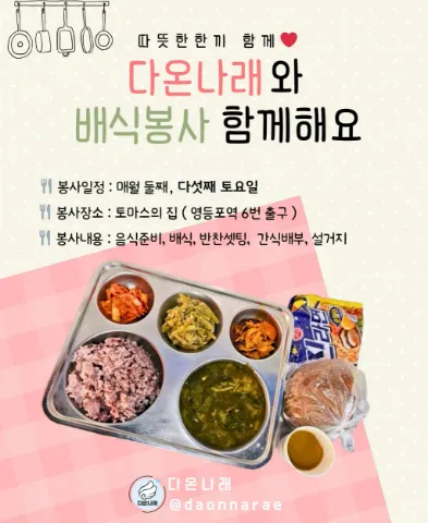 <따뜻한 마음을 함께 나누는 비영리 봉사 단체> 👐다온나래👐는 좋은 일이 찾아온다는 뜻의 '다온'과 날개를 의미하는 '나래'를 합친 이름으로, 봉사를 통해 희망의 날개를 펼치고 따뜻한 나눔이 이어지는 세상을 만들어가고자 하는 봉사모임입니다. 💕 ⬇️다온나래의 봉사 활동⬇️ ✔ 정기 봉사 • 매월 2째 주, 5째 주: 배식 봉사 (영등포 토마스의집) • 매월 4째 주: 유기견 보호소 봉사 (파주 빅독포레스트) ✔ 이벤트(계절) 봉사 & 기부 활동 • 플로깅,연탄 봉사 등 다양한 봉사와 기부 활동 진행 📌가입 24시간 내에 실명으로 <가입인사>부탁드립니다. ※ 미작성 시 강퇴처리 됩니다.🥲 ※ 80년생까지만 가입 가능합니다.🙏 📌다온나래 봉사 참가비 안내 (선입금 후 참석) ✔ 기업은행 514-049440-01-013 다온나래 ※ 입금시 "실명/참석날짜" 기재 부탁드립니다. ① 참가비 : 5,000원 (1회) ② 월 회비: 10,000원 (정기) * 월회비 납부 회원은 봉사 참가비 무료