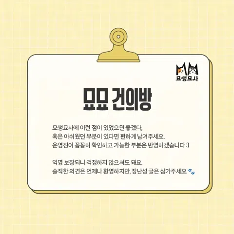 🐈⬛ 고양이와 함께하는 집사들의모임🐈⬛ 🐱 집사만 가입 가능 🐱 😺 부산,양산,김해,창원,울산 친목모임. 😽소소한 벙개 ,모임에 참석 환영 - 3개월 1회이상 벙참여 필수! (자진탈퇴가능하나, 운영진논의후 재가입) - 당일취소🙅♀️ 😼정보공유,취미활동,봉사등 운영중 지나친이성목적 등 목적외 활동 금지. 교배예정💥가입불가👋 (중성화 필.중성화예정자 가능)