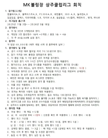 볼링을 통해 ~ 친목🙋♀️🙋♂️도모 하고 누구나 편안하게 오셔서 즐길수 있는 * 300볼링🎳 클럽 !! - 연령은 304050~ ( 초보 및 볼러 환영 ) - 정기모임 : 매월 2,4주_ 목요일 저녁 7시 30분 - 장소 : MK볼센터 구로점 - 가입후 -> 게시판 공지-자소서 양식에 따라 가입인사해주세요 (24시간 이후 글내용 없음 강퇴) ㅡㅡㅡ 클럽가입 참고사항 ㅡㅡㅡ 🙅♀️ 타모임장 운영진 가입불가^^ 🙅 가입 후 한달이내에 1회이상 정기전활동 무조건 참석 🙅♀️ 타인에게 불쾌감을 주는 말이나 행동 🙅 술주사 편가르기 이간질행위 🙅♀️ 원하지않는 스토커(접근)행동 🙅 금전요구 강제퇴장 대상이 됨을 알려드립니다!!