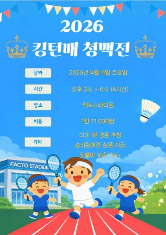 Since 2024.12.25 👑가입조건👑 90~05년생 구력 6개월 이상 또는 레슨 3개월 이상 👑준비물👑 개인 라켓(다이소 및 문방구 라켓 No) 배드민턴화 셔틀콕 3개씩 - 26,000원 이상 셔틀콕 👑[정기모임 안내]👑 매주 토요일, 일요일 오후 7~10시 총 3시간 (!매주 월요일 오후 12시 투표 오픈 >> 매주 금요일 오후 6시 투표 마감!) 대관비 인당 10,000원 한 코트당 정원 6명! 전체 정원 수 = (대관 코트 수 × 6명 + 2명) 👑환불 및 당일 취소 책임비👑 사전정산글 게시된 이후부터 당일 전에 취소 할 경우에 대기자가 없다면 환불 불가! 당일 취소할 경우엔 취소 책임비가 발생 당일 취소 책임비-10,000원 (!단, 부고상 및 전염병 제외!) 👑[킹턴과 잘맞는분]👑 - 매너있는 2030 남/여 - 가입 직후 한달이내 1회 참석 가능한 분 👑[킹턴과 안맞는분]👑 - 가입 후 24시간이내 가입인사 미작성 - 3개월 동안 정기모임 불참 (불참 시, 운영진에게 사유를 알려주세요.) - 참석 투표 후 사전 연락없이 전날 또는 당일 취소 - 예의없거나 비매너, 영업, 종교 및 이성 교제 목적 등 모임의 분위기를 해치는 경우 게스트 토 일