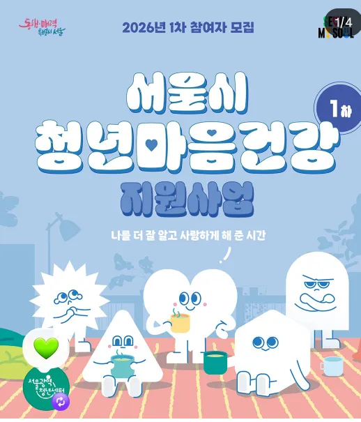 🌱모임방 소개🌱 다들 이런 고민하나쯤 있게 마련이죠. 🎈직장 및 직무스트레스로 혼란스러운 경우 🎈동료나 주변 사람과의 대인관계에서 갈등을 겪고 있는 경우 🎈우울, 불안등의 정서적 어려움을 겪고 있는 경우 🎈성격 문제로 힘들어하는 경우 🎈취업스트레스와 진로 문제로 고민하는 경우 🎈자기이해를 통해 보다 성장하고 싶은 경우 🌈프로그램 종류 🌼개인상담 🌼심리검사 🌼모래상자놀이치료 🌼그림책 마음챙김명상 🌼마음돌봄 치유프로그램 🌼감정노동치유 프로그램 🌼MBTI 강의 등 심리강의 등 =================================== 📢 2026년 정신건강 심리상담 바우처 안내합니다. 게시판에 올린 웹자보를 참조해주세요. =================================== ✅️ 자주 게시판을 봐주세요. 무료 심리상담 및 특강 또는 유료 프로그램 안내가 입수되는대로 올리겠습니다. 자주자주 놀러오세요^^