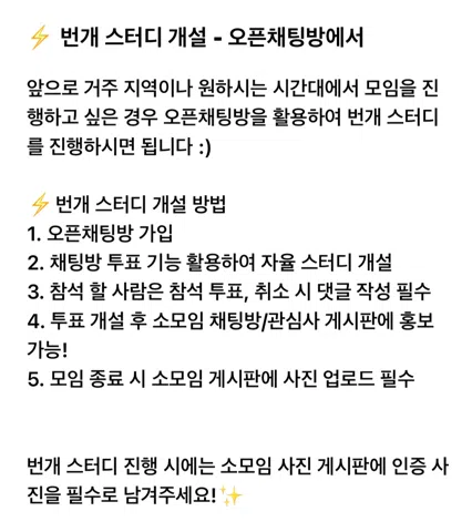 퇴근후 7시부터 9시까지! 같이 성장해요! 혼자하면 잘 안하게 되고 느슨해지죠? 같이하면 오래가요✌️📚 매일 2시간씩 하다보면 원하는 목표에 가까워질 수 있습니다🩶카페에서 같이 일해요 :) 🙌성장을 원하는 직장인/취준생 분들 저희와 함께해요! 📋강퇴 대상 *탈퇴, 강퇴 회원 재가입 불가 1. 가입인사 12시간 이내 미작성 시 2. 당일취소 3회 누적, 전날취소 6회 누적 시 3. 미사유 당일취소 1회, 노쇼 1회 시 (전체채팅방 사유 작성) 4. 불쾌한 장난, 언행 / 분란 조장 시 5. 이성에게 부담을 주는 과도한 접근 시 6. 영업, 홍보, 다단계, 포교 활동 시 건의사항은 운영진에게 1:1 채팅으로 문의 바랍니다.
