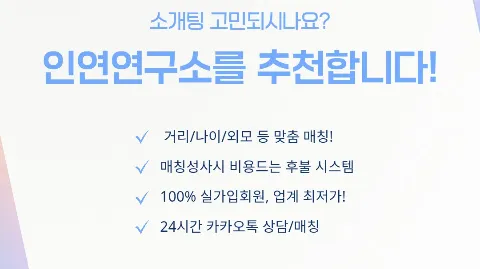 🎀 여성회원님 1회 무료소개팅 이벤트중 🎀 주말에도 24시간 문의,상담이 가능합니다:D ‼️저희 인연연구소는 타 소개팅 업체와 전혀 관련이 없으며 자체적으로 운영하고 있습니다‼️ 사업자등록된 정식 소개팅업체입니다. 소개란을 꼼꼼하게 읽어주시면 감사드려요🥹 🌸 국내최초 후불제 도입 ! + 업계 최저가 매칭이 성사되어야 결제하는 후불제도입! 돈만 버리고 매칭 안 된 적 있으신가요❓️ 그런 걱정No ! 책임지고 매칭해드립니다. 그렇다고 아무나 만나지 않는 맞춤형 매칭👀❣️ 🎁 신원인증된 회원, 100%실회원 매칭! 신원인증된 실가입한 회원님들과의 매칭입니다! 알바나 허위회원 일절 🚫 만약 그럴 경우 100배 보상을 약속드립니다!!!! 😆 거리,나이,외모 등 맞춤형 매칭! 내가 원하는 조건의 이성을 소개받아야 만족도가 올라가는 법💕💕 만족도 최상!! 인연연구소 문의하는 곳 🫶 💬 카카오톡 : mini0107617 홈페이지: www.inyeon.today ❓️이런 분들께 추천드립니다. 지인 소개팅보다 더 맞춤형 소개를 원하시는 분 다양한 곳에 가봤지만 돈만 날리셨던 분 제대로 된 소개팅 업체를 찾으시는 분 인연연구소에서 나에게 맞는 인연을 찾아드립니다🥰 아무나 만나지 않는 연애 시작하세요