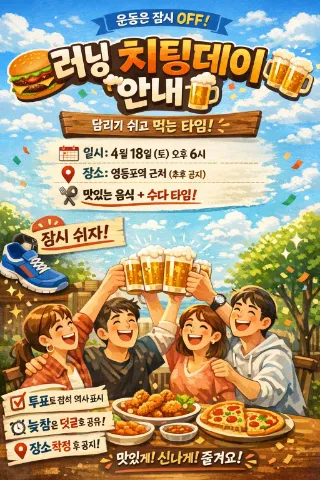 🐥신도림 런닝 모임 <오픈멤버모집> (초보·취미 환영) 친목과 즐겁게 운동 하기 위해 인원제한 130명입니다. 기존 인원들 친해지면 운영진 판단하에 점차 늘릴 예정입니다.(매달 1일) ✔ 동네에서 가볍게 운동하고 싶은 분 ✔ 런닝이 처음이라 민폐될까 걱정되셨던 분 ✔ 혼자서는 작심삼일이었던 분 🏃♂️ 현재 운영 방식 • 페이스 : 1km당 7분 (러닝머신 8.5수준) • 거리 : 4 ~ 5km • 목표 : 다 같이 완주 ※ 도착 300m전은 자율페이스 인터벌구간 입니다. ※ 모임원 실력 향상에 따라 거리·페이스는 조정됩니다. ※ 전문 러닝크루가 아닌 동네 취미 모임입니다. 빠른 기록 갱신이나 강한 훈련을 원하시는 분과는 맞지 않을 수 있습니다. 📍 장소 : 신도림 집결지 (공지 사진 참고) 🗓 정기 러닝 : 매주 월 / 수 / 목 20:00 (공휴일 제외) ⚡ 번개런 : 모임원 요청 시 진행 🍗 매달 1회 치팅데이 진행 ⭕️ 가입가능나이 1987 - 2004 🚫 23시 이후 가입금지 🚫 모임 페이스 이상 강요금지(사전 동의 제외) 하루 마무리를 건강하게 런닝으로 뛴도림🏃♀️🏃♂️ 26.02.22 오픈 #도림천 #러닝 #런닝 #구로 #안양천