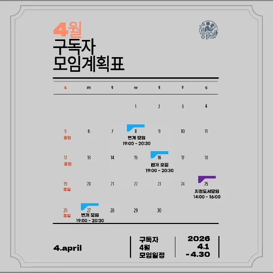 책에 재미가 느껴지지 않는다면 그건 실패한 독서다 ▪︎혼자 읽고 끝내는 독서 X, 같이 읽고 함께 해나가는 독서 O ▪︎실천없고, 대화 없는 독서 X, 실천해보고 느낀점을 나누며 진짜 내것으로 만드는 독서 O 독서뿐만 아니라 영화도 함께! 가벼운 느낀 점부터 심도 있는 내용까지! 모임을 통해 다양한 이야기를 들어봐요. ☆! 가입 후 가입인시 작성 부탁드립니다 !☆ ▪︎진행시간: 평균(19:00~20:30) ▪︎활동 장소: (구리, 노원) 📕모임종류 번개,정기모임(자유도서) -각자 읽고싶은 책을 가져와 독서, 대화 -30분 독서 30분 이야기 -독서 초보자 추천👍 (모임에서 읽은 책을 여러번 가지고 오셔도 괜찮습니다^^) 지정도서(선택) -지정 도서 투표진행 톡방에서 투표가능 (톡방참여 조건:번개,정기모임 1회 참석) -발제문 작성으로 집중 분석, 토론🔥 -조용하고 집중 할수있는 세미나실 이용 📚 테마모임 -N주간 매일 독서 인증 비대면 챌린지 -실내를 벗어나 피크닉 독서 -전시 관람, 장르 통일 독서 등등 매번 다른 테마 속에서 책을 더 자유롭고 깊게 만나보세요. (자세한 내용은 공지를 확인✅️) 🚫주의사항 -모임 당일 취소 시에는 간단한 사유 작성을 부탁드리며, 사유 미작성 시 운영상 제재