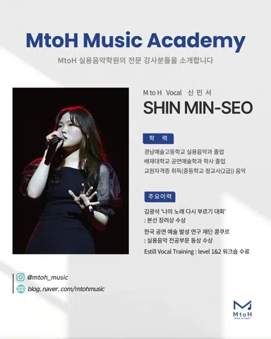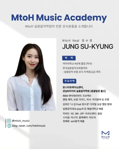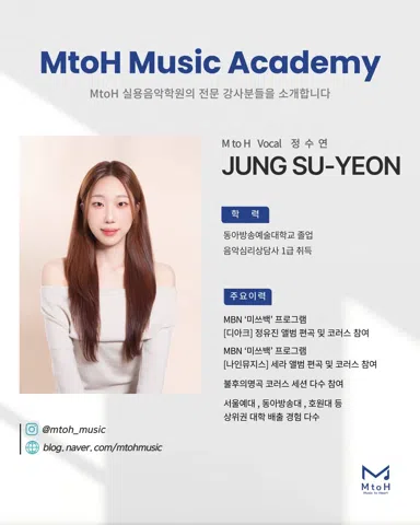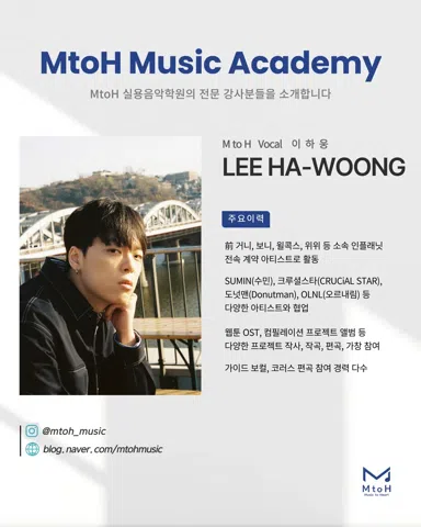 MtoH 에서 함께 노래하실 분을 찾습니다 ❗️ 🔹어떤 곳인가요? - 새로 오픈한 깔끔한 시설 - 개인 맞춤형 레슨 - 취미부터 입시, 오디션 준비까지 목표에 따른 체계적 커리큘럼 🔹이런 분들 환영해요 ! - 노래를 처음 배워보고 싶은 초보자 - 더 체계적으로 실력을 키우고 싶은 분 - 무대 경험을 쌓고 싶은 분 🔹MtoH 만의 특별함 ⭐️ - 전문 강사진의 1:1 개인지도 - 녹음실 완비로 자신의 목소리 모니터링 가능 - 개인 / 그룹 레슨 가능 📍영등포구 양남사거리 인근 * 자세한 위치는 문의 주세요 :)