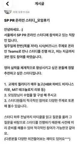 🥰편안한 일상 대화🌏국내외 시사/교양 토론 🤝🏻좋은 멤버들과 함께🪴새록새록 성장하는 영어 실력💪🏻 𝓢𝓲𝓷𝓬𝓮 𝟚𝟘𝟚𝟜.𝟘𝟠.𝟙𝟠 1. 가입 절차 게시판 상위 고정 게시글에 있는 "최신 양식"으로, 자기소개 댓글 작성 1️⃣일 이내 완료 ⇒ 단톡방 입장 2. 문의사항: 모임장 오픈카톡으로 연락주세요 https://open.kakao.com/me/spjjune 3. 일시: 주말 오전 11시 4. 스터디 구성 1)🌿SP L'oun'ge 일상다반사와 관련된 주제로 편안한 대화 &📰SP PR(=Peer Review) 국내외 시사/교양 관련된 아티클 기반 토론 2)⚡️번개 Pop-up 운영진 혹은 멤버 주관의 번개성 스터디 3)🖼️문화 생활🎨 5. 매너🫶🏻 1) 스터디 참석 취소할 경우, 채팅방에 '참석 취소' 안내를 꼭 해주세요 작은 배려 부탁해요🙏🏻 2) 안내없이 취소할 경우, ❌노 쇼로 간주🥲 6. 참여 제한⚠️ 가입 절차 미-준수 / 노 쇼 / 노 매너 / 오직 이성 목적