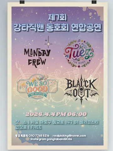 🌟 ✴️ 굳이 밴드를 안해도 초보라도 상관없어요✴️🌟 🌟 ✴️ 음악을 좋아하는 누구나 가입할수 있어요✴️🌟 ⛔️ 나이제한 없어요 ⛔️ 자소서는 반드시 작성 하세요 ⛔️ 합주관전, 뒤풀이 누구든 환영해요 ⛔️ 인성, 주사, 꼰대, 여미새 등등 피해주면 강퇴요 합주실 관리자 리얼피킹님의 기타레슨 교실과 백두산드럼 박찬님의 드럼레슨 교실을 운영해요 유료에요 ㅎ 공연팀이 되시면 월 회비 5만원이고 연3회 공연해요 🔯 |밴드소개| ⚠️ 블랙아웃 | 헤비메탈, 하드락 ⚠️ 복세편살 | 자작곡, qwer컨셉 ⚠️ 먼데이크루 | 락, 가요, 팝 ⚠️ 스핀헤드 | 헤비메탈, 하드락 🔯 |모집중| ⚠️ 로저윤밴드 | 7080 | 악기파트 모집중 ⚠️ 오케바리 | 데쓰메탈 | 드럼,보컬,베이스 모집중 ⚠️ 먼데이크루 | 락, 가요, 팝 키보드 모집중 ⚠️ 스핀헤드 | 헤비메탈, 하드락 기타 모집중(여성우대) 🔯 |합주일정| ⚠️ 먼데이크루 | 매주 월 오후 7시 ⚠️ 블랙아웃 | 매주 금 오후5시 ⚠️ 복세편살 | 격주 토 오후6시 ⚠️ 스핀헤드 | 매주 일 오후2시