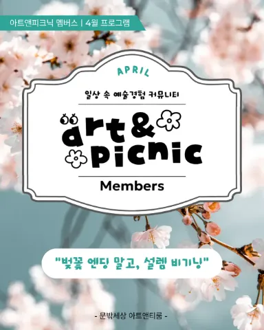 일상의 감도를 높이는 예술경험 커뮤니티! [아트앤피크닉 멤버스]에 오신 것을 환영합니다. 여러분을 위한 세 가지 피크닉을 제안합니다! 🌿 슬로우 피크닉 | 나를 위한 느린 걸음 - 숨가쁜 일상에 쉼표가 필요할 때, 느림의 미학으로 여유를 되찾는 힐링 시간입니다. 🎨 예술로 피크닉 | 일상 속 예술적 발견 - 드로잉, 필사, 공예, 아트투어(전시&공연 관람) 등 오감을 깨우는 활동으로 일상의 감도를 높이는 시간입니다. 👫 썸타는 피크닉 | 취향으로 시작하는 설렘 - 문화예술이라는 공통의 관심사로 자연스럽게 연결되는, 연애가 조심스러운 어른들을 위한 고감도 소개팅입니다. 매달 새로운 프로그램을 통해 나만의 취향을 발견하고, 결이 맞는 사람들과 느슨하게 연결되는 공간입니다. 모든 과정에 참여하지 않아도 괜찮아요. 당신이 머물고 싶은 순간부터 천천히, 편안하게 함께해요! ✨️이런 분들과 함께하고 싶어요! ✔️풍요로운 취미: 문화예술을 통해 일상의 감도를 높이고 싶은 분 ✔️세련된 연대: 비슷한 결을 가진 사람들과의 느슨한 연대를 원하는 분 ✔️예술적 영감: 반복되는 하루에 뜻밖의 설렘과 영감을 더하고 싶은 분 ✔️도심 속 발견: 성북천과 성곽길 등 도심 속 숨은 장소를 색다르게 경험하고 싶은 분