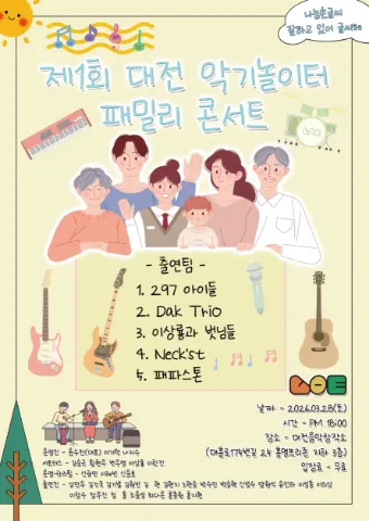 기타🎸, 베이스🪕, 드럼🥁, 키보드🎹, 보컬🎤 등 함께 음악🎶을 즐기며 놀 수 있는 모임입니다. 😆음악에 열정과 관심을 가지신 분들 모두 환영해요😄 (기초과정 연습 도와드립니다🎵) 😸매주 토요일 오후 5시~11시에 정기모임이 있어요~ 🤗가입 후 게시판에 소개글을 읽어주세요!! 😺 닉네임은 꼭 실명으로 부탁드립니다 :) ❓️모임문의 : 카카오톡 오픈채팅 - 대전 악기놀이터 검색 ❓️월회비 : 2만원(신입회원은 입회비 포함 3만원) 🚫 가입제한 : 동종모임 가입자, 광고, 영업, 종교, 무매너 등 🚫 광고, 영업, 종교, 불법, 비방, 폭언욕설 경고 및 강퇴 🚫 정기모임 한번도 참석하지 않은 사람 벙개, 야유회 참석 제한 ⚠️ 동종모임 가입자, 외부 밴드•모임 구인, 놀이터 오프라인 모임 장기 미참석자는 회원 정리(강퇴) 대상입니다.