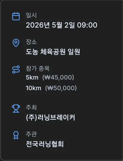 👋Runners Hi부터 Runner's High까지🏃♂️ 같이 달려요🙂(Since 2024.11.12~) ⭐️정기런 모임 매주 목요일 20:00 정기 운동 🕗 모임 장소: 태릉입구역 장미공원입구🌹 러닝 km: 5km, 10km 협의 진행 페이스: 그룹 530 / 600 / 630 / 700 🏃♂️5'30"~ 7'00" 페이스 그룹 별로 나누고 초보, 런린이, 잘 뛰시는 분 컨디션에 맞게 그룹 러닝 진행해요 초보자도 부담없이 같이 뛰어요🙂 🎮클라이밍, 보드게임, 볼링, 등산, 배드민턴, 포켓볼 등등 다양한 취미 활동 벙도 좋아요!!! ✨️2주에 1회 이상 정기 운동 참석이 가능하신 분만 가입 부탁드립니다.🙏 🌈가입비: 3,000원(소모임 운영을 위한 비용) ⚠️카톡방 입장 필수 ⚠️운동 목적이 아닌 여미새, 남미새, 종교, 영업🚫 가입 후 24시간 이내 자기소개 미 작성시 강퇴 가입 후 1달 이내 모임 미 참석 시 강퇴 ⚠️미 참여(1달 이내), 비매너, 부적절한 행동 시 강퇴하겠습니다. ⚠️가입후 가입비 환불은 어렵습니다. ⚠️카톡방 참여 후 정기모임 참석 가능합니다