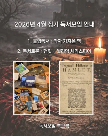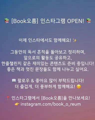 📚 책과 함께하는 소통과 성장의 시간 Book O-Reum에 오신 걸 환영해요! 4/11 몰입독서 : 각자 가져온 책 4/25 토론 : 햄릿 - 윌리엄 셰익스피어 * 책을 좋아하는 사람들이 모여 자유롭게 이야기 나누고 시각을 확장하는 공간 * 메시지, 지식, 감정을 함께 나누며 깊이 있는 통찰을 얻는 모임 * 서로 다른 생각을 존중하고 열린 마음으로 토론해요 📖 독서를 처음 시작하는 분도, 책을 오래 사랑해온 분도 모두 환영합니다! 🎨 예술 감상 / 🏃 취미 활동 / 🎊 파티 / 🚗 여행 / 🤝 편한 교류! ✔️ 지정 도서: 매달 1~2권, 다양한 분야에서 선정 ✔️ 정기 모임: 매달 둘째·넷째 토요일 15:00 ✔️ 회비: 월 1,000원 (첫 참석 후 안내) ✔️ 당일 무단 취소는 삼가 주세요. ✔️ 문의: 모임장에게 DM 주세요! * 신규 가입: 90년생 ~ 06년생 함께 읽고, 함께 나눠요! 📸 instagram.com/book_o_reum Since 2017