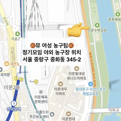 [신규 모집 & 초보 대환영!⛹️♀️] 20•30대 위주 친목 도모 / 즐농 위주 신생 여성 농구팀입니다! ⏰ 시간 평일 수 or 목 오후 7시30분 ~ 9시30분 🗺️ 장소 중랑천 일대 야외 농구코트 (게시판에서 위치 확인) ✅ 꼭 읽어주세요! • 게시판 필독 후, 가입인사 양식에 맞게 작성 • 가입 후 한 달 안에 모임 1회 이상 참여 必 • 기간내 미참여 시 강퇴처리 오픈카톡 👉 https://open.kakao.com/o/gbVjpBph 비밀번호는 쪽지로 안내드려요☺️ - 뮤 팀의 캐치프레이즈: 농구는 즐거우라고 하는 것🏀🏆