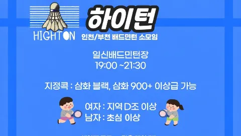 🏸 부천 • 인천 배드민턴 모임 🏸 ❣°ʚ 하 이 턴 ɞ°❣ ━━━━ 🔶 가입 기준 🔶 ━━━━ 💟 2045 (06~81년생/빠른X /지인 40대 가능) 💟 기본 매너 보유자 (비매너 강퇴) 💟 남자 구력 1년 이상 /여자 지역 D조 이상 (지인은 조율 가능) ☞ 로테이션 미숙으로 안전상 사고 발생 위험이 있는 경우 게임 매칭이 어려우실 수 있습니다 ━━━━ 🔶 가입 절차 🔶 ━━━━ 🙆 가입 후 24시간 내 자기소개 작성(사진 첨부) 🙆 단톡 입장 🙆 입금액 : 가입비 5,000원(1회) + 반기회비 🙆 반기회비 ☞가입 당월 면제 ☞신규회원 : 3,000원 x 남은 반기 개월 수 ☞기존회원 : 18,000원 (6, 12월 입금) 계좌 : 3333362780493 카카오뱅크 한주희 ━━━━ 🔶 운동 정보 🔶 ━━━━ 🙋 장소 : 일신 배드민턴장 (월 휴무) 🙋 시간 : PM 7시 ~9시반(토 3시~6시) 🙋 입장 : 무료 🙋 콕 : 하이턴 공식 셔틀콕만 가능!!! ━━━━ 🔶 주의 사항 🔶 ━━━━ 🙅 운동 목적 이외 가입 X (보험, 종교, 이성 등)