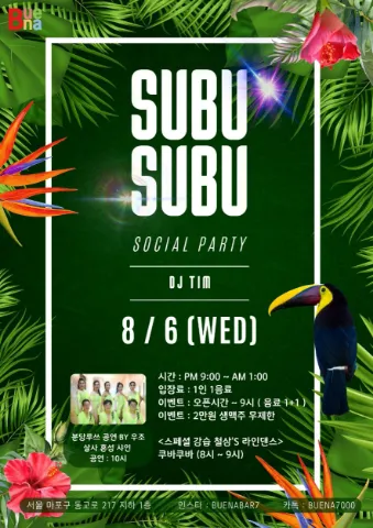 홍대점&압구정점/살사댄스,바차타댄스 1)일일체험(2시간에 3만원) 2)정규강습(4주코스/월 8시간에 11만원으로 할인적용!) -일시: 평일낮/평일저녁/주말저녁 1교시: 살사댄스 2교시: 바차타 -요일별 강습 일정: 수욜 점심 11~1시/장소:홍대점 화욜 저녁 7~9시/ 장소:압구정점 수,금요일 저녁 7~9시/ 장소:홍대점 토,일요일 저녁 6~8시/장소:홍대점 -강습장소: -강습장소: 홍대강습실 1호점 주소: 서울 마포구 동교동 174-8 홍대강습실 2호점 주소: 서울 마포구 월드컵북로 6길60. 2층&3층(고기살롱 건물) 압구정점 주소: 서울 강남구 도산대로 25길 22. -하루코스 일일체험 비용: 2만원(60분 수업) 3만원(120분 수업) -4주코스 정규강습 월회비: 9만원 (월6시간) 11만원(월8시간) 13만원(월10시간) 입금계좌: 새마을금고 9003 2397 8639 6.이춘임. 입금 후 최종신청이 완료. 문의: 010 4613 0810(담당강사:빌리) 카톡아이디: billy0810