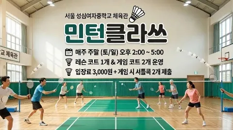 "민턴클라쓰"에서 주말을 활기차게 보낼 신입 회원을 모집합니다! 🏸 안녕하세요! 용산 성심여중 체육관에서 주말 오후를 열정으로 채워가고 있는 배드민턴 동호회 "'민턴클라쓰"입니다. 이번에 우리와 함께 땀 흘리며 운동할 실력자 분들을 새롭게 모시게 되었습니다. 📌 모임 안내 1. 장소: 성심여자중학교 체육관 소피아홀 (서울 용산구 원효로19길 49) 2. 일시: 매주 토/일요일 주말 오후 2시 ~ 5시 (3시간 집중 운영) 📌 코트 운영 (총 3면) 1. 회원분들이 대기 시간 없이 효율적으로 운동하실 수 있도록 코트를 분배합니다. 2. 레슨 코트 (1면): 집중 실력 향상을 위한 전용 공간 3. 게임 코트 (2면): 회원 간 급수별 팽팽한 매칭 진행 📌 이용 안내 및 준비물 1.일일 게스트비: 3,000원 (신한은행 110-315-069286 김현수) 2. 준비물: 개인 라켓, 배드민턴화, 개인 물통, 셔틀콕 3.게임 참여 시 개인 셔틀콕 2개 제출 필수 (KBB79, 강상연301, 삼화블랙 이상급) 📌 가입 조건 (꼭 확인해 주세요!) 1. 4월 이후 부터는 남자 D조 이상 가입 가능 2. 필수 사항: 가입 후 1시간 이내 자기소개서 작성