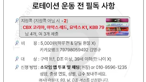 안산 배드민턴 모임 로테이션입니다😀 📍새로오신 분들 1시간 이내로 '가입인사' 작성 📍나이 및 구력 제한 안내 나이 : 39세 이하 (87이하,기존 가입자 유지) 구력 : 남/여 구력1년이상 로테이션 가능자 📍셔틀콕 관련 안내 CBX코리아, 아약스레드, 요넥스 K-1, kbb79, 지정콕만 사용▶️남:4개 / 여:3개 📍주말 정모 참석 신청 안내 ▫정모 : 매달 3-4회 토요일 대관 운동 4시간 📍회비 및 게스트 비용 안내 ▫️회비 : 상반기3만원(1-6월) 하반기3만원(7-12월) (중도 가입자 월5천원*개월수) ▫️게스트 대관 정모 참가비: 5,000원 *입금 후 신청 접수 완료(미납 시 자동 참석취소) *하루전&당일취소 환불불가 (번개는 게스트비 없이 입장료만 지참) ▫️계좌 : 79798059492 카카오뱅크 (김영규) ⛔️강퇴대상 -비매너, 지나친 훈수, 영업, 남미새, 여미새, 모임 분위기를 해치는 분 -안산 지역 배드민턴 운영진 및 모임장