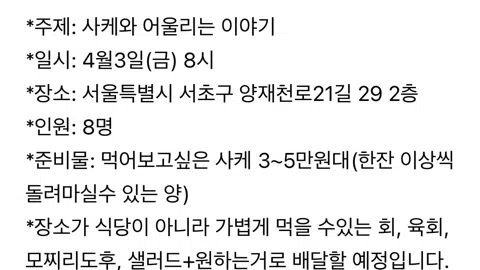 ✨양재천 인근 주민들의 소소한 만남✨ 📌정기모임 - 매월 1회 정모 💕드라이브/골프/카페/산책/러닝/맛집/배드민턴/등산/볼링/보드게임 📌가입제한 ‼️양재/우면/도곡/대치/역삼/개포/서초/내곡 주민만 가능‼️ - 나이:85년~99년 - 가입후 24시간 내 자기소개 미작성시 OUT - 기혼자/돌싱, 불순한 목적, 분위기를 해치는 분 OUT(언제든 모임장에게 말씀주세요) - 타모임 4개 이상❌(본 모임포함 4개까지) - 탈퇴 후 3개월간 재가입❌ 📌공지사항 - 카톡방 운영(말없이 단톡 나가지 않기⚠️) - 모든 벙 3명 이상시 진행