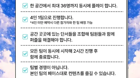 방탈출을 좋아하는 뇌섹남녀들의 모임 방탈출에 진심인 사람 환영🔥 - 나이제한: 90~04 - 가입 모임 3개 이상: 가입 금지 - 방탈출(Main)🔐🚪 - 크라임씬🕵♂️🕵♀️, 보드게임🎲, 머더미스터리🕴️, 마피아🎭, 구스구스덕🦆, 하앤싴(Hide-n-seek), 연극🧟♂️ 등 Activity - 더지니어스, 여고추리반, 대탈출 등 좋아하는 사람! - 주요 활동 지역: 인천(부평), 서울(홍대/강남/건대) 등 - 도파민 러버, 쫄/탱/초보자/고수 모두 환영! - 두 달간 활동이 없을 시 강퇴 처리됩니다! - 가입 직후 가입인사 작성 및 오픈채팅 입장 부탁드립니다! 잠수일 시 강퇴처리되니 재가입 해주세요! - 소통을 위해 오픈채팅을 운영중입니다. 더 많은 일정은 오픈채팅 일정에 올라와 있습니다! - 채팅/일정 활발하게 올라오고 있으니 어서 오세요! - 신입을 배척하지 않고, 친목을 지양하고 있으니 편하게 함께 어울리시면 됩니다!