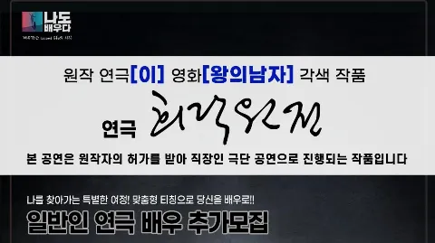 연기가 처음인데 이 정도로 잘하게 됐다고? 경험무관! 열정만 있다면 O.K 내가 할수 있을까 걱정마세요. 연기는 자기 자신을 알아가고 표현하는 법을 배우는 것입니다. 누구나 할 수 있는 일입니다. 진심을 다해 알려드리겠습니다. 무대에 진심을 담고 있습니다. 무대에 성의를 다합니다. 극단 나도배우다입니다. ✔ 군자반 / 사당반 / 신촌반 운영 중 ✔신규단원 선택사항 공연 클래스, 1대1 노래 또는 연기 개인레슨 ✔정단원 선택사항 정식 등록 될 프로 무대 공연 영화제 출품용 독립영화 (신규단원께서 공연클래스 3회 이상 참여시 정단원으로 입단이 가능)