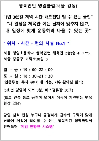 1년 365일 저녁 시간 배드민턴 칠 수 있는 곳. #20대 #30대 #40대 & 70년대생 #강동 #광진 #송파 #중랑 #구리 #하남 #남양주 #가입인사 작성과 공지사항 확인은 필수^^ 명일초 행복민턴 체육관 2층 월~금 : 오후 7시 ~ 10시 토~일 : 오후 6시 30분 ~ 9시 30분 아래 3가지 중에서 해당되시면, 요일 관계없이 방문 가능🏸 (입장료, 주차비, 난타콕, 샤워실 사용 무료) "월 최대 3회" 1. 행복민턴 명일클럽🏸 가입 의향이 있으신 분 (3회 방문 이후 상호합의하에 접수) 2. 자매 클럽 회원님들 (프로필 표기시 지역 대신 클럽명 표기) 3. 행복민턴 명일클럽 관련 공식대회 출전 파트너 (대회 준비 기간에 해당) "월 최대 2회" 4. 타클럽 회원이면서 교류 방문을 희망하시는 분 => 사전 문의 배드민턴에 대한 예절, 기본 매너 & 에티켓을 가지신 분은 실력이나 급수에 차등을 두지 않고 누구나 참여가능. (무리한 훈수, 모사꾼 완전 사양) 게스트 & 클럽 회원 구분없이 당일 참석 인원 누구나, 게임 현황판 시스템에 맞춰서 공정하게 난타와 게임에 참여하실 수 있습니다. 주차 60여대 가능 셔틀콕 : 삼화블랙, 삼화900+, KBB79, KK7000
