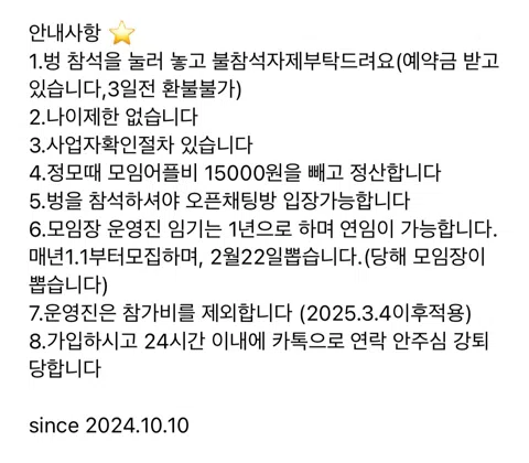아무나 가입 못하는 모임 👉가입문의 카카오톡플러스친구"여성사업자모임" 검색후 채팅주셔야 가입이 됩니다 안녕하세요 소모임 최초 여성사업자모임입니다💋 예비창업자도 받지만,사업경험 있는 예비창업자를 받습니다. 진행 할 프로그램 ☀️ 1.자기계발 독서 스터디📑 2.날 좋을때 골프 🏌️♀️ 3.각자 (할,하고있는) 사업 프레젠테이션📋 4.브런치 , 호텔조식,라운지바 모임🍱 5.건강을 위해 등산 🏃♂️ 6.생일자 생일파티 🎆