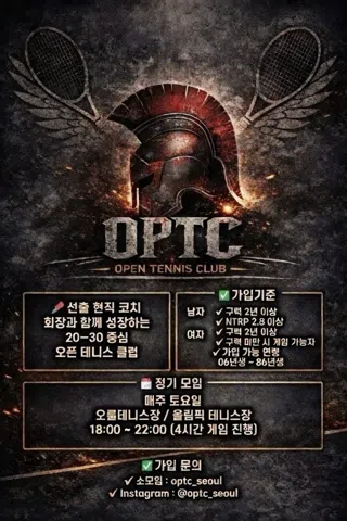 선출 현직 코치 회장님과 함께 성장하는 20-30 오픈 테니스 클럽에서 여러분을 기다립니다! 대회 참가예정자, 대회입상자 환영. 남/ 2년이상 or NTRP 2.8이상. 여/ 2년이상 or 구력미만시 게임가능자. 06 ~ 86년생 가입가능🎾 대회입상자는 코트비 혜택. 🔈정기모임 ✅️매 주 토요일 장소 : 메인 오륜테니스장 or 올림픽테니스장. 이용시간 : 오후 6시~10시 (4시간) 📌공지사항 1️⃣ 소모임은 공지용이며 모든 정모 참석은 네이버카페를 이용하여 진행합니다. ✔️네이버에서 “오픈테니스” 검색 🔸️링크 : https://cafe.naver.com/olympicopen ✔️가입인사는 네이버카페에 작성(운영진이 소모임 연동) 2️⃣ 가입문의 🔸️소모임 운영진 DM 🔸️인스타 : opentennis_seoul 3️⃣ 소모임 가입 후 필독 공지사항 정독 필수! 4️⃣ 소모임 가입 당일 네이버카페 가입인사 작성 필수! 5️⃣ 정모비는 정모 전 금요일 자정까지 입금 필수! 6️⃣ 게스트 참석은 2회까지 가능