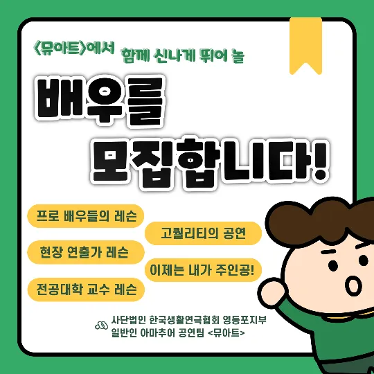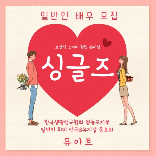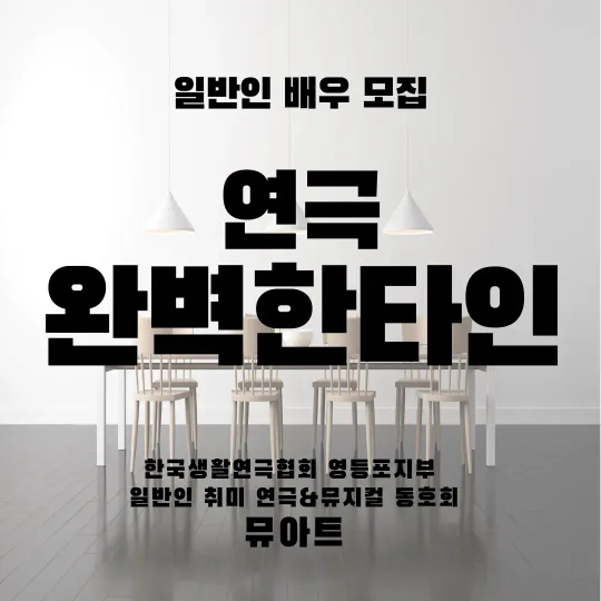 안녕하세요 일반인 취미 연극&뮤지컬 동호회 <뮤아트> 입니다~^^ 초보 환영합니다~!! 👉뮤지컬이나 연극에 관심이 많은 사람 👉무대 위 배우를 해보고 싶은 사람 👉특별한 취미가 해보고 싶은 사람 👉뮤지컬/연극을 만들며 친구를 만들고 싶은 사람 👉삶이 무료한 사람 전공자/비전공자 가릴 것 없이 남녀노소 누구나 신청가능합니다! 카카오톡 오픈채팅 https://open.kakao.com/me/muart 🔥목요일반 뮤지컬 <싱글즈> 모집중🔥 🔥토요일반 뮤지컬 <영웅> 모집중🔥 🔥토요일반 연극 <완벽한타인> 모집중🔥 용기내 연락주시어 좋은 공연 그리고 좋은 인연 되기를 희망합니다😊