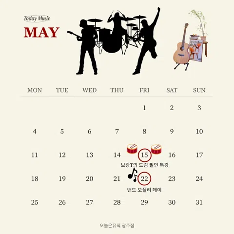 2030 뮤직 소셜 모임 '오늘은 뮤직' 음악을 통해 같은 관심사를 가진 사람들과 좋은 시간을 보내는 것에 집중하고 있어요. 전문적인 음악 레슨을 받으며, 함께 공연을 준비하고, 다양한 소셜모임과 스페셜한 클래스들을 들을 수 있답니다. 레슨을 받지 않아도 콘텐츠를 함께 할 수 있어요! 오늘은 뮤직은 음악을 통해 보다 더 행복한 오늘을 맞이할 수 있게 여러분과 함께 할게요:) 🎈Content - O'ply 정기공연 - O' salon (대화/감상/창작/체험형 4가지 유형의 콘텐츠를 통해 음악을 매개로 취향이 같은 사람들과 연결되는 커뮤니티 활동 - O' class (뮤지컬, 연기, 디제잉, 악기 원데이 클래스) 🙆이런 분은 환영해요! - 열린 마음으로 사람들과 다양한 소통을 하시려는 분 - 음악을 사랑하고 좋아하는 관심사를 나누시려는 분 🙅♀️이런 분은 불편해요! - 이성에 대한 관심을 노골적으로 드러내시는 분 - 상대방에 대한 존중이 없는 대화를 나누시려는 분 - 특정 종교적 포교 활동을 목적으로 들어오시는 분 ☀️광주광역시 북구 용봉로 76 3층에 위치해있어요!