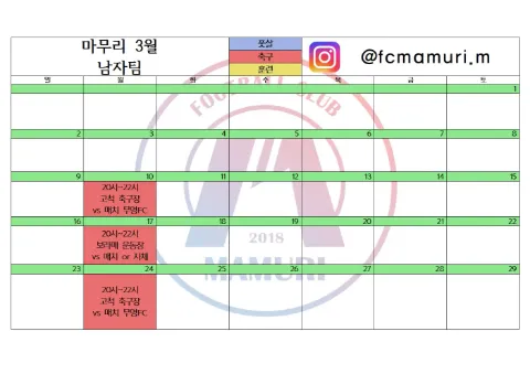 🤝마무리 공식 협력병원 새움병원🏥 ⚽️ 그들만의 리그를 꿈꾼다 ⚽️ 풋살 축구 친목 전문모임(평일,주말) ⚽️ 달에 2회 훈련(평일,주말) ⚽️ 실력보다는 인성과 열정🔥🔥 잘하는사람보다 좋은사람을 찾습니다 ⚽️ 여성분들도 대환영(매니저!!)👍 ⚽️ 가입 후 공지사항 꼭!!!읽어주세요 ⚽️ 가입 후 24시간 이내 자기소개 미작성시 강퇴 ⚽️ 특별사유없이 한달에 1회이상 참석없을시 강퇴 ⚽️ 인스타 @fcmamuri.m (영상,사진) ⚽️ 가입하신분들은 카톡보내주세요 : bye3692