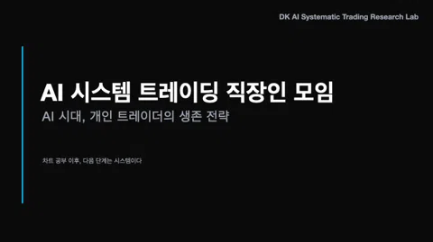 AI 자동매매 봇을 만드는 사람들 직장은 언제든 사라진다 시스템은 남는다 AI는 이미 그림을 그리고, 음악을 만들고, 영상을 편집합니다. 이제 금융도 자동화되는 단계에 들어섰습니다. 직장은 평생 보장되지 않습니다. 구조조정, AI 자동화, 경기 침체 앞에서 개인은 언제든 대체될 수 있습니다. 10년 후 개인 투자자는 차트를 직접 클릭하지 않을 가능성이 큽니다. 개인이 자체 자동매매 시스템을 운용하는 시대는 이미 시작되었습니다. 지금 준비하는 사람과 준비하지 않는 사람의 격차는 시간이 지날수록 벌어집니다. 퇴근 후 차트를 보는 방식은 지속 가능하지 않기때문에 시간을 대신할 시스템을 가져야 합니다. 직장은 사라질 수 있지만, 시스템은 계속 작동합니다. 본 모임의 커리큘럼은 DK AI Systematic Trading Research Lab에서 자체 개발한 독립 프로그램으로 운영됩니다. 고급 기술 내용이 포함되어 있어 참여자는 내부 운영 규칙에 따라 비공개 방식으로 학습합니다. AI 시스템 트레이딩 직장인 모임은 소모임 차트 러닝크루 졸업생을 위한 연구 공간이며, 일반인 참여도 가능합니다. 차트 러닝크루 졸업생을 우대합니다. 가입 후 1시간 내 가입 인사 미작성 / 양식 미준수 / 3개월내 세미나 미참석자는 강퇴합니다.
