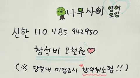 ✋️늦은 밤 시간엔 채팅방에 인사 자제해주세요. 공부한다는 느낌없이 그저 꾸준히, 편하게 회화하고 싶은 분들을 위한 모임🫶 ☘️ 정모 : 매주 화or목or토or일 주 2-3회 10:30am-12:30pm ☘️ 위치 : 영통로290번길 23 202호 (망포역12분 거리/상가 뒤편 무료주차) ☘️ 요건 : 나이 85년생-10년생 : 간단한 문장구사 가능한 초보자 o.k ☘️ 스터디 참가비 : 5천원 (장소 및 커피 제공) ❗️참석 신청 후 당일까지 입금, 미입금시 참석 취소 ☘️ 스터디 인원 : 요일별 기본 4~7명 ☘️ 스터디 진행방식 : weekly topic에 맞춰 자유롭게 회화 🚫 지속적인 당일노쇼, 지각 시 강퇴 조취 🚫 포교활동, 맴버간 불편감 유발 시 강퇴 조취 ⚠️타 플랫폼 동시 운영중이므로 이곳에서 참석인원 3~5명만 받습니다.
