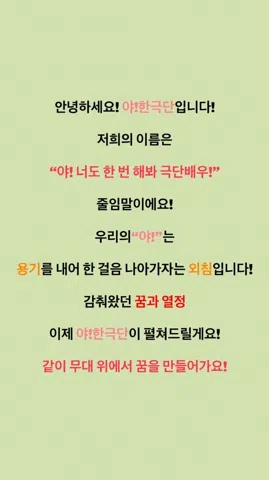 💕야!한극단⭐️ 야! 너도 한 번 해봐! 극단 배우! h.p 010-2432-3810 카톡 damro0115 3기 [누구라고 했죠?] 모집 마감!!! 한 번뿐인 인생 별거 있어? 해보고 싶은 건 더 늦기 전에 해봐야지! 언제까지 미룰래? 주인공은 바로 너!👈 당신의 꿈⭐️을 펼쳐보세요! 야! 너도 한 번 해봐 극단 배우 모집중! 🧡일반인, 대학생, 직장인🩷 ❗️연기에 관심있고 제대로 배워보고 싶으신 분! ❗️인생에서 한 번쯤은 무대에 올라가 보고 싶은 분! ❗️뻔하지 않은, 그러나 성취감 만큼은 최고의 취미를 원하시는 분! ❗️공연의 주인공이 되고 싶은 분! ❗️평소 소심하거나 자신감이 떨어져 한 번쯤 자신을 바꿔보고 싶은 분! 망설이지 말고 전화주세요.